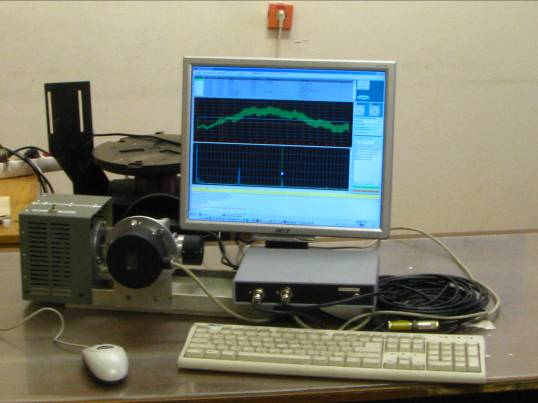 | Пример диагностирования волнового редуктора с использованием кинематомера Диакин-3 В качестве примера практического использования кинематомера «Диакин 3» для контроля зубчатых передач и редукторов рассмотрим результаты проверки кинематической точности волнового редуктора. Проверяемый редуктор имел в своём составе ведущий вал, на котором установлен волновой генератор h с двумя роликами,неподвижное жёсткое зубчатое колесо b c чиcлом зубьев Zb=204 и подвижное гибкое зубчатое колесо g c числом зубьев Zg=202, объединённое с ведомым выходным валом. Передаточное отношение редуктора i =101. На рис. п.1.1. представлена фотография кинематомера «Диакин 3», использованного при проверке редуктора. На фотографии показаны измерительный блок кинематомера и дисплей компьютера, на котором представлены графики временной функции и спектра кинематической погрешности. (Системный блок компьютера, также входящий в комплект кинематомера, на рисунке не показан.) На рис. п.1.2., п.1.3. и п.1.4. представлены фотографии подготовленного к проверке волнового редуктора. На фотографиях видно, что на выходном (тихоходном) вале редуктора установлен инкрементный датчик углового перемещения ЛИР 190А, а на входном (быстроходном) вале - датчик углового перемещения ЛИР 350. Датчики помощью кабелей подключены к ответствующим входам измерительного блока.