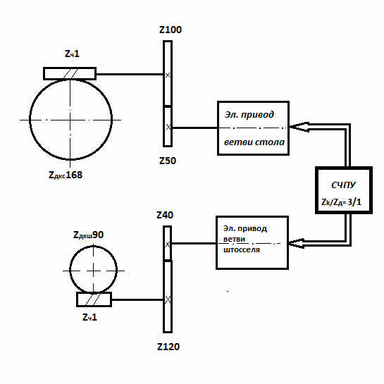 | Рис.П.2.1. Кинематическая схема цепи обката-деления зубодолбёжного станка 5М150 ПФ