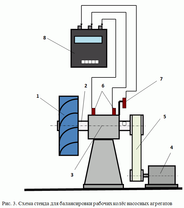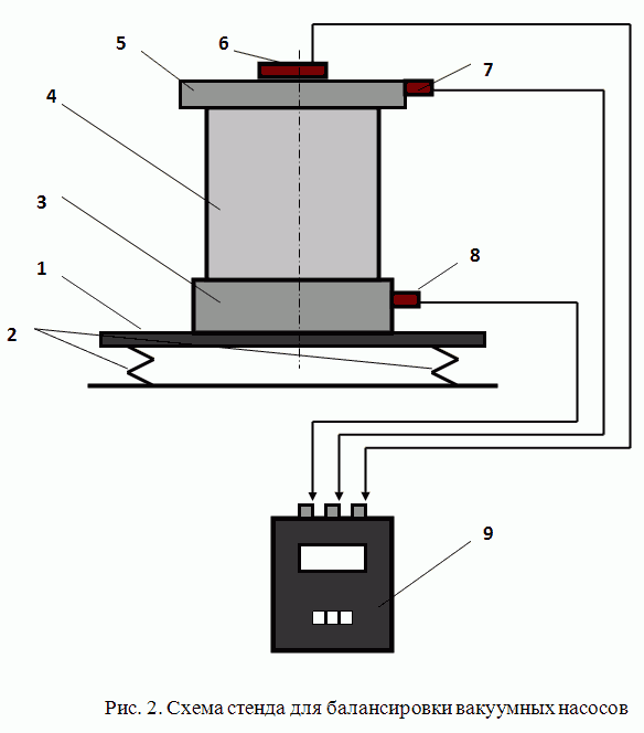 Указанные стенды обычно разрабатываются для балансировки конкретных изделий или деталей. Причём главной целью их создания (естественно помимо достижения заданного качества балансировки) является необходимость сокращения издержек, связанных с приобретением и эксплуатацией штатных балансировочных станков. Ведь ни для кого не секрет, что стоимость этого вида оборудования высока и, в зависимости от массы и габаритных размеров балансируемых роторов, может колебаться от сотен тысяч до нескольких миллионов рублей. В этой связи хотелось бы поделиться опытом, накопленным нашим предприятием при решении данных нестандартных балансировочных задач. Возможно, он будет полезен специалистам, стремящимся оптимальным образом решать задачи по балансировке выпускаемой ими продукции. Тем более, что сейчас появился новый относительно недорогой балансировочный прибор «Балком 1», который может использоваться в качестве измерительно-вычислительной системы в любых балансировочных стендах. 1. Стенды для балансировки канальных вентиляторов Когда в конце 90-х годов прошлого века на ЗАО «Вентиляторный завод «Лиссант» было начато производство канальных вентиляторов, возникла необходимость разработке специальных стендов для их балансировки. Указанные стенды разрабатывались нашими специалистами совместно с конструкторским отделом ЗАО»Лиссант». Основными требованиями, предъявляемыми к этим стендам, являлись высокая точность балансировки в двух плоскостях, характеризующаяся уровнем остаточной вибрации не выше 0,05 мм/сек на частоте вращения ротора, и производительность, которая должна была составлять не менее 20 изделий в час. После ряда экспериментальных проработок была выбрана конструкция стенда, представленная на рис. 1. Указанный стенд состоит из платформы 6, установленной на трёх пружинных опорах 7. Характеристики пружин выбраны таким образом, чтобы собственная частота колебаний стенда на пружинах составляла не более 1/3 частоты вращения ротора канального вентилятора. Это обеспечивает эффективную отстройку стенда от установочного резонанса и способствует достижению высокого качества балансировки. На платформе закреплён патрон 5 (цанговый или кулачковый), обеспечивающий возможность быстрого установа на стенд и съёма с него балансируемого вентилятора 4. На платформе также закреплён кронштейн 9, используемый для крепления на стенде двух датчиков вибрации 2 и датчика фазового угла 3. Датчики подключены к соответствующим входам измерительно-вычислительного блока прибора для балансировки 1, с помощью которого производится измерение вибрации вентилятора на частоте его вращения и расчет параметров корректирующих грузов, обеспечивающих надлежащее качество балансировки канальных вентиляторов. Для повышения производительности балансировки в качестве корректирующих грузов используются наборы специальных пружинных клипс (разной массы), устанавливаемых на лопастях вентилятора. В настоящее время на подобных стендах балансируются все типоразмеры канальных вентиляторов, изготавливаемых ЗАО «Вентиляторный завод «Лиссант». ![]() 2. Стенд для балансировки вакуумных насосов Стенды для балансировки вакуумных насосов разрабатывались по заказу ОАО «Завод «Измеритель» в 2002 и 2009 годах. Основным требованием при разработке данных стендо