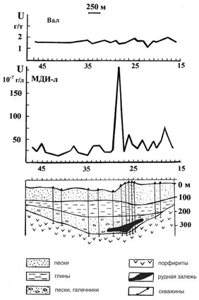 Показано, что валовые содержания рудных элементов в почвах не выделяют глубокозалегающую рудную залежь. А наиболее эффективным для поисков и локализации рудных залежей, расположенных на глубинах в сотни метров, оказалось применение метода МДИ-л. Так, с поверхности все рудные тела однозначно фиксируются контрастными практически несмещенными аномалиями ионно-подвижных форм рудных элементов метода МДИ-л с коэффициентом контрастности К = 5-10 и более. Борта палеодолины, вмещающей оруденение, также отмечаются аномалиями МДИ-л, но уже меньшей контрастности. Эффективность и достоверность метода МДИ-л подтверждена также проводимыми здесь впоследствии буровыми работами.