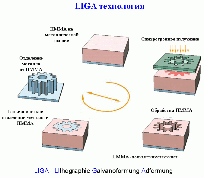 Технология поверхностной микромеханики ориентируется на базовые кремниевые микротехнологии. Одна из доминирующих в настоящее время. В ее основе лежат два процесса: нанесение жертвенного, а затем и рабочего слоев и удаление через отверстие в рабочем слое жертвенного для формирования объемных полостей между рабочим слоем и подложкой (Рис. 4). Последовательность технологических операций при реализации поверхностной микромеханики практически сводится к известным последовательностям, используемым в планарной технологии. При этом может требоваться нанесения более толстых пленок и значительно большая глубина травления. Конструкция может содержать значительное число слоев и технологический процесс имеет значительно больше этапов. Основные достоинства – близость к базовым технологиям микроэлектроники и связанная с этим возможность создавать электронные узлы на одном чипе с микромеханическими структурами. Высота выполняемых структур определяется толщиной наносимых слоев. Ограничения по высоте выполняемых структур (единицы микрометров) сужают возможности разработчика. Технологии объемной микромеханики по технологическим приемам и оборудованию существенно отличаются от базовых технологий микроэлектроники. Технологии глубинного объемного травления наряду с технологией поверхностной микромеханики имеют самое широкое распространение. Это групповые технологии, целый ряд операций выполняется на основе стандартных планарных процессов. Позволяют реализовать реальные 3D – структуры, используя жидкостное (в щелочных или кислотных травителях) (Рис. 5) и сухое (плазменное) травление (Рис.6). Недостатком является невозможность создания достаточно сложных электронных схем на том же чипе. LIGA-технология: сущность процесса формирования объемных структур заключается в использовании рентгеновского излучения от синхротрона для получения топологических картин с глубокими стенками в полимерном материале (рентгенорезисте) (Рис. 7). После формирования осуществляется электрохимическое осаждение металла в образовавшуюся в полимере полость. Удаление полимера обеспечивает получение металлической матрицы заданной формы, с помощью которой конфигурация многократно воспроизводится литьем или штамповкой пластика, или формовкой сырой керамической массы с последующим отжигом. Основным недостатком и причиной ограниченного распространения данной технологии является необходимость использования синхротрона, уникального оборудования некоторых ядерных исследовательских центров. Волоконно-капилярные технологии еще только выходят за рамки лабораторной практики и представляют интерес в отдаленной перспективе. Технологии индивидуального формообразования основаны на прецизионном программно – управляемом позиционировании лазерного или механического рабочего органа. На ряду с рядом возможностей уникальных по разрешающей способности и сложности воспроизводимой топологии эти технологии имеют невысокую производительность и высокую стоимость. |